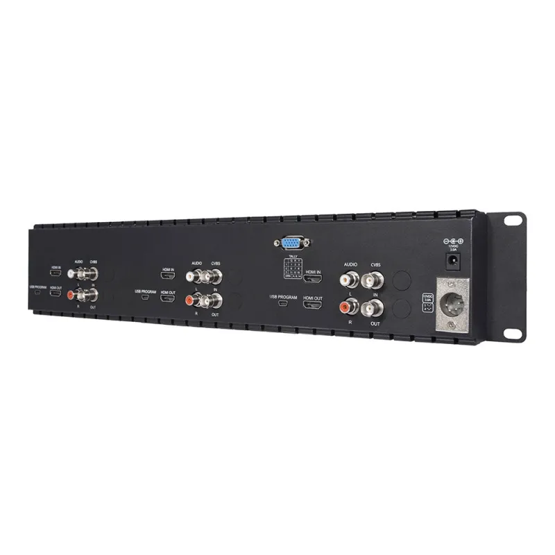 The Feelworld T51-H is an ultra-thin HDMI 3 RU rackmount monitor with GPIO network control designed for efficient broadcast monitoring of up to 3 1080p60 signals. The T51-H has 3G-SDI, HDMI and composite BNC inputs and outputs per screen, as well as RCA audio inputs for each panel.