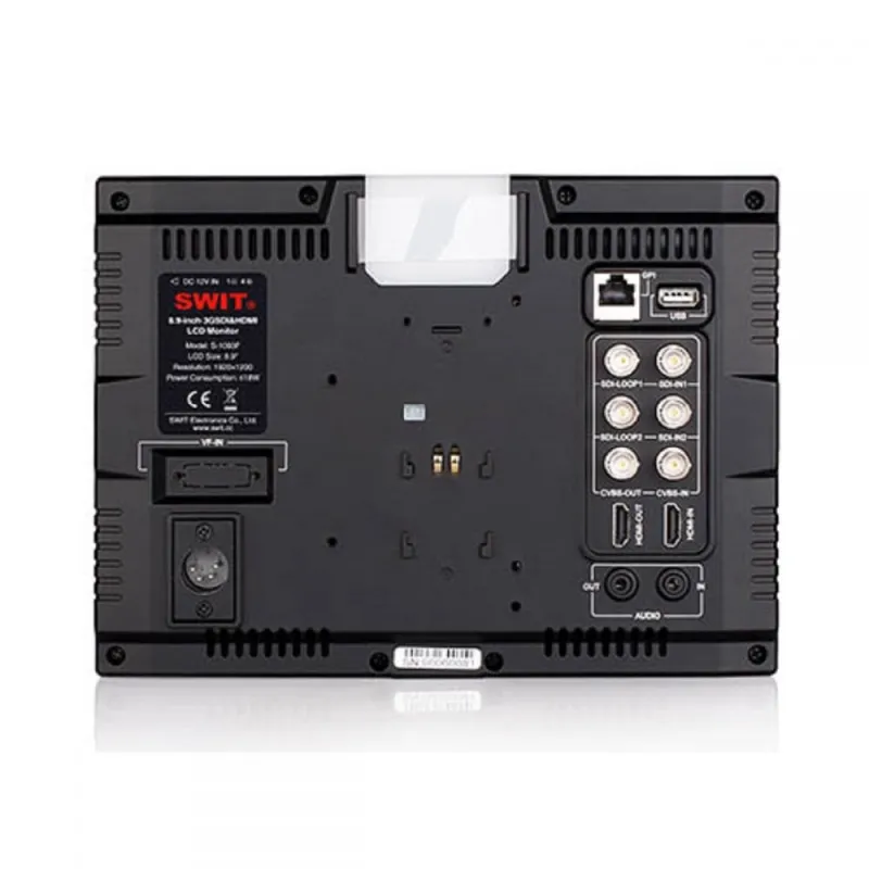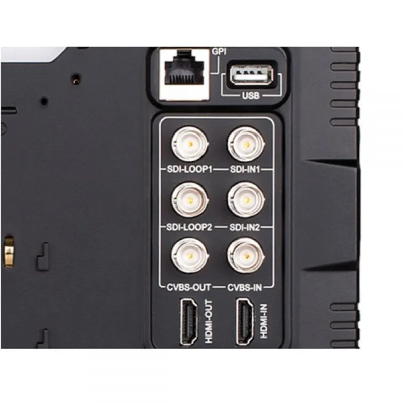 The monitor provides a 4-pin XLR socket of DC 6.5-24V power input, and can be fixed on V-mount, Gold mount or DV battery plate.