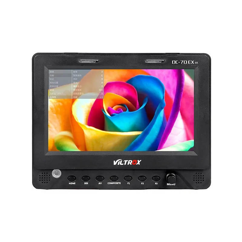 Lengvas DC70 EX 7“ LCD monitorius iš Viltrox suteikia profesionalų stebėjimą su aiškiu 7“ ekranu, tinkamu lauko naudojimui, turinčiu 1024 x 600 raišką. DC70 EX palaiko iki 1080p vaizdo įrašus, taip pat įvairius HD ir SD formatus per HDMI, SDI ir AV įėjimus, ir suteikia HDMI ir SDI perėjimo išėjimus, kad vaizdą būtų galima siųsti į kitą monitorių.