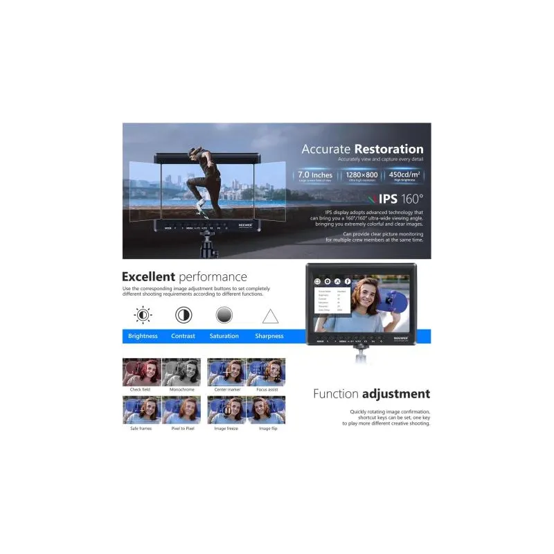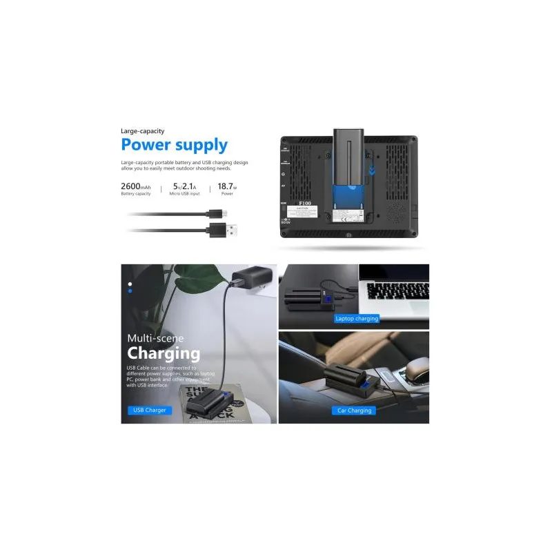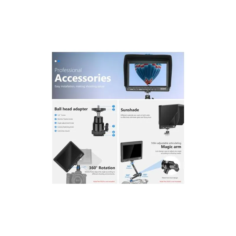Neewer F100N-MA yra profesionalus 7&qt; HDMI kameros lauko monitorius, kuris pateikiamas kaip pilnas filmavimo rinkinys, įskaitant 2600 mAh NP-F550 akumuliatorių, USB įkroviklį ir stebuklingą ranką. Šis paruoštas naudoti rinkinys idealiai tinka DSLR ir be veidrodžių vaizdo operatoriams, kuriems reikia patikimos realaus laiko stebėsenos su lanksčiu tvirtinimu ir nepriklausomu maitinimu.
