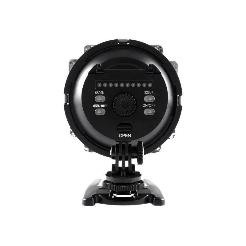 built-in diode (216 pcs.) to give two kinds of light with an adjustable color temperature in the range 3200 -5500 Kelvin. Light output and color temperature can be adjusted smoothly by turning in the range of 1-100%. The lamp is equipped with switches for changing the brightness in steps of 10% or precisely 1%. Reflector panel is a status indicator and battery strength indicator.