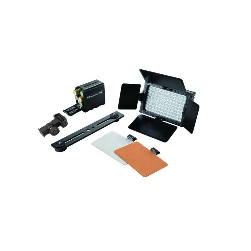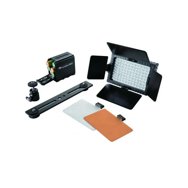 Falcon Eyes LED Lamp DV-96V-K2; Tilting Bracket; Battery NP-F550; ChargerMounting Bracket; Barndoor Set; Diffuse Filter; Colour Filter Orange; Battery holder