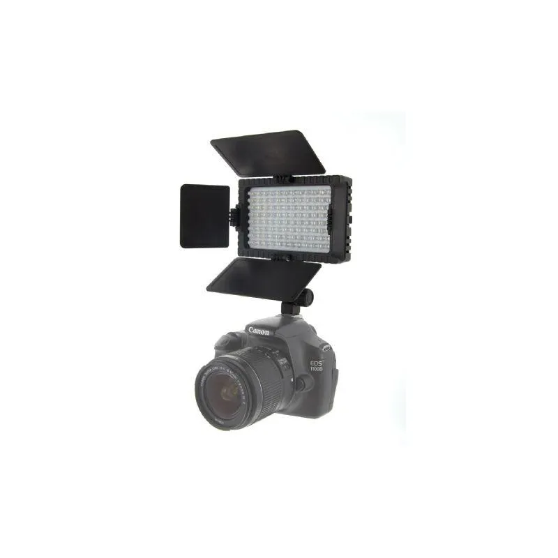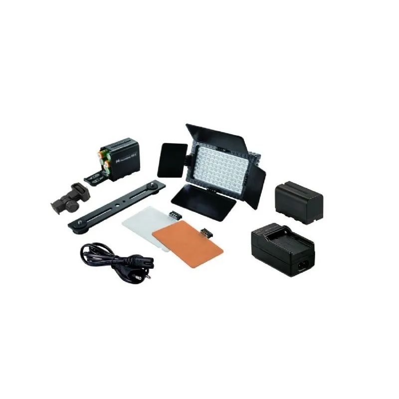 Lamp; Tilting Bracket; Battery NP-F550; Charger; Mounting Bracket; Barndoor Set; Diffuse Filter; Colour Filter Orange; Extra Battery holder for 6 AA Penlites Powerful LED video light Up to 1300 lux Color temperature: 6000 K 0% - 100% dimmable Compact and portable