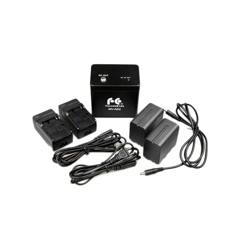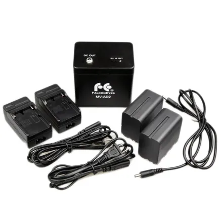 The Falcon Eyes MV-AD2 Battery Pack consists of a battery holder, 2 powerful NP-F960 batteries and a battery charger.