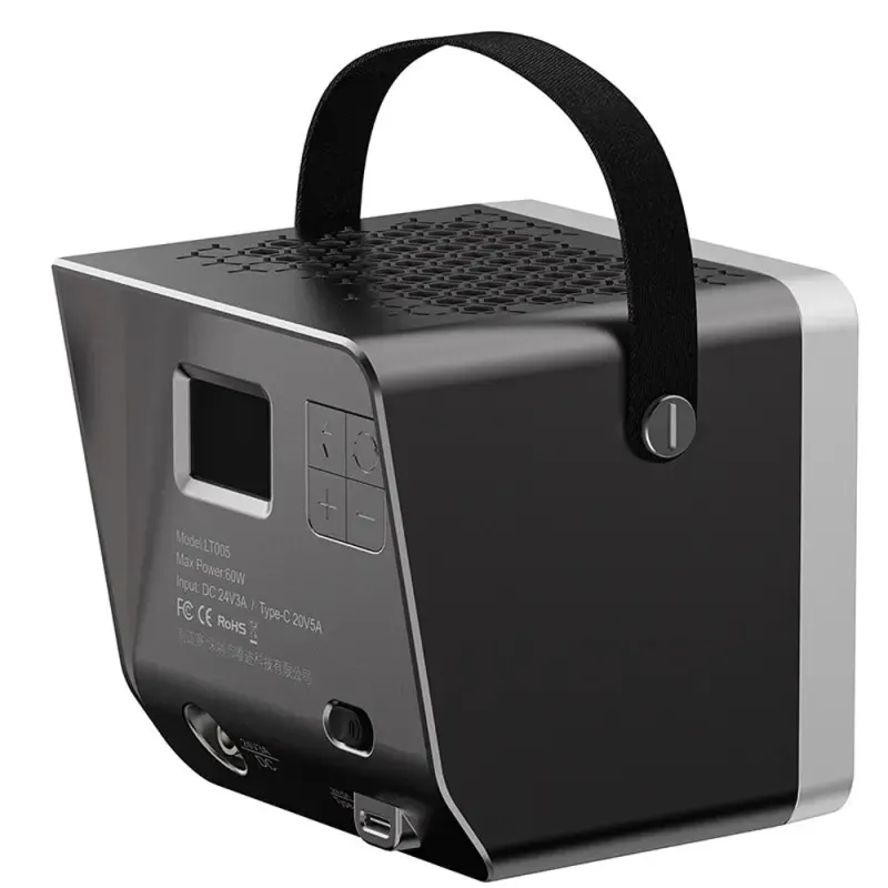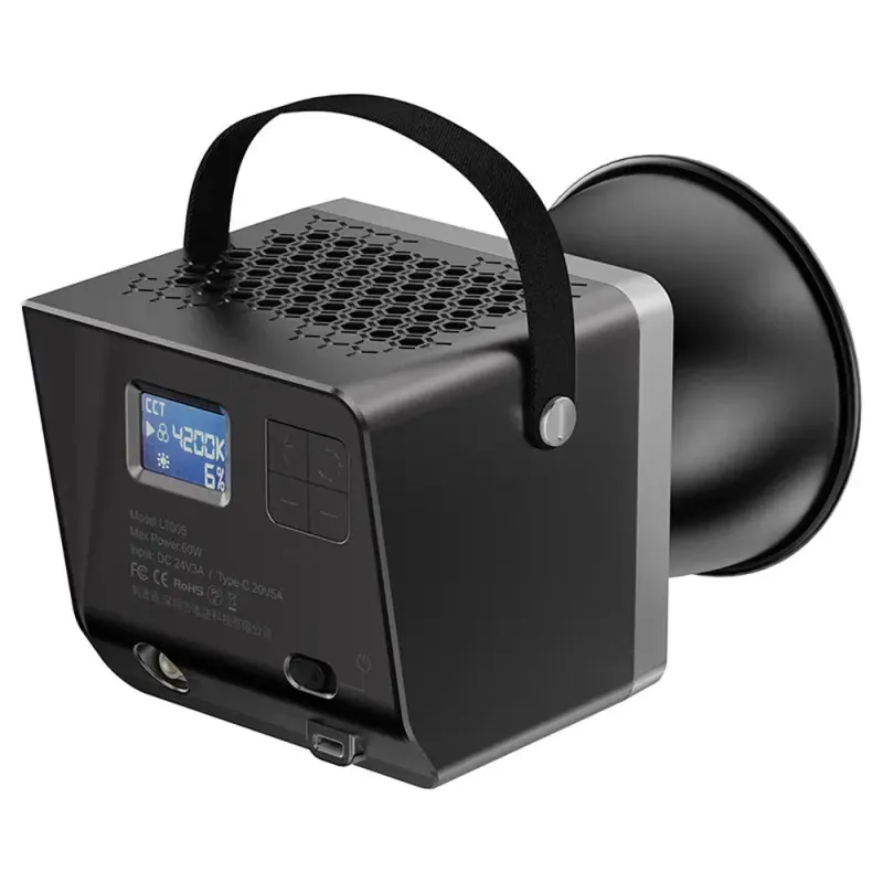The LT005 60W Bi-Color COB Light is a cube-shaped lamp with a ribbon handle for easy use and portability. The OLED display makes it easy to operate. The Chip on board beads have a lifespan of over 20,000 hours and high lumens up to 40000 within a 3-6m light range.