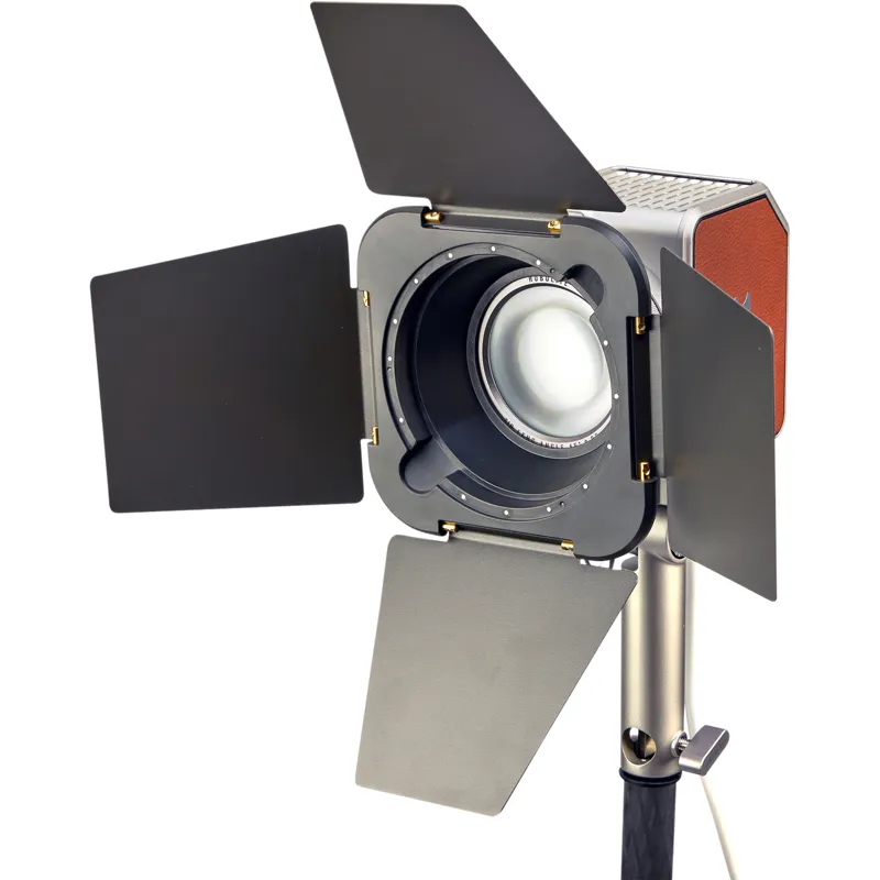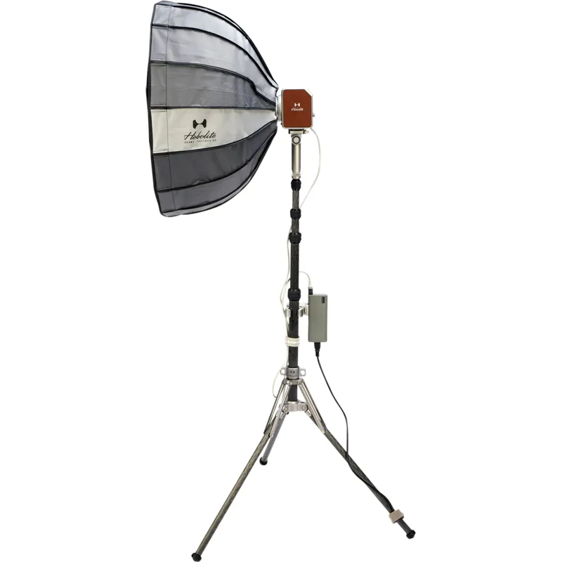 This kit includes the Avant light, a barber kit with colored filters, a V-mount handle, a V-mount clamp, a D-tap cable, and a power source. It also comes with a light stand and softbox for a complete studio setup. Additionally, a separately available Bowens mount adapter allows for the use of full-size light modifiers. The kit is packaged in a stylish, durable bag for easy storage and transport.