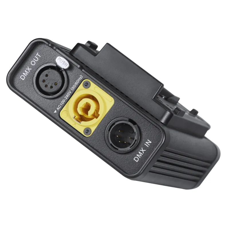 The S60Bi come with a separate controlling box which supports AC power supply and V mount battery (optional), the design separating control box from light body secures better cooling effects. Apart from the on board operation on the controlling box, they support APP, RC A6 remote, and DMX as remote control methods.