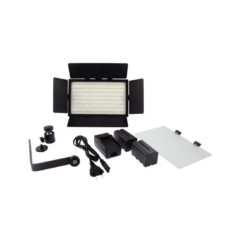 Lamp; Tilting Bracket; Battery NP-F550; Charger; Mounting Bracket; Barndoor Set; Diffuse Filter; Colour Filter Orange; Extra Battery holder for 6 AA Penlites Powerful LED video light Up to 1300 lux Color temperature: 6000 K 0% - 100% dimmable Compact and portable