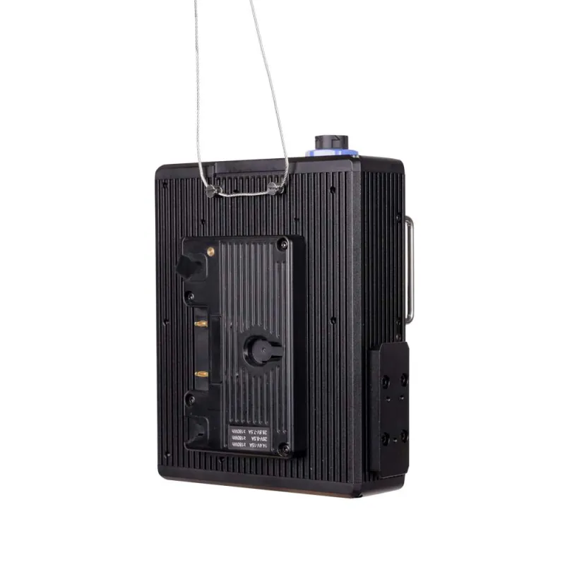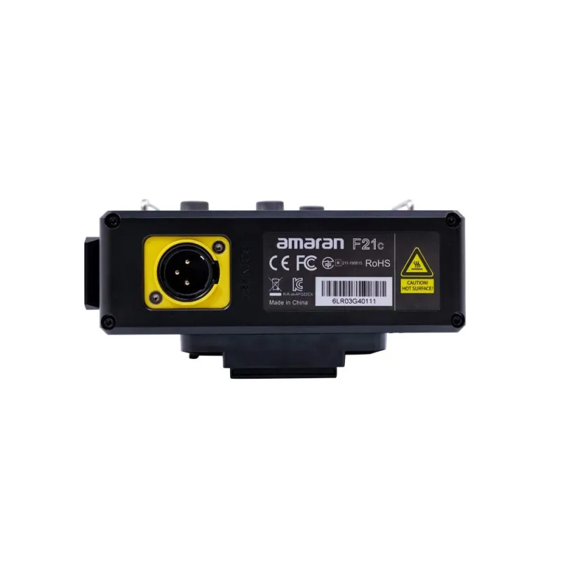 The control box is a multi-voltage AC power supply that features a V-mount battery plate for use with compatible 14.4V, 26V, or 28.8V batteries. Full output can be achieved when using the AC power supply, using batteries allows the F21c to be used at either half or full power, depending on battery strength.