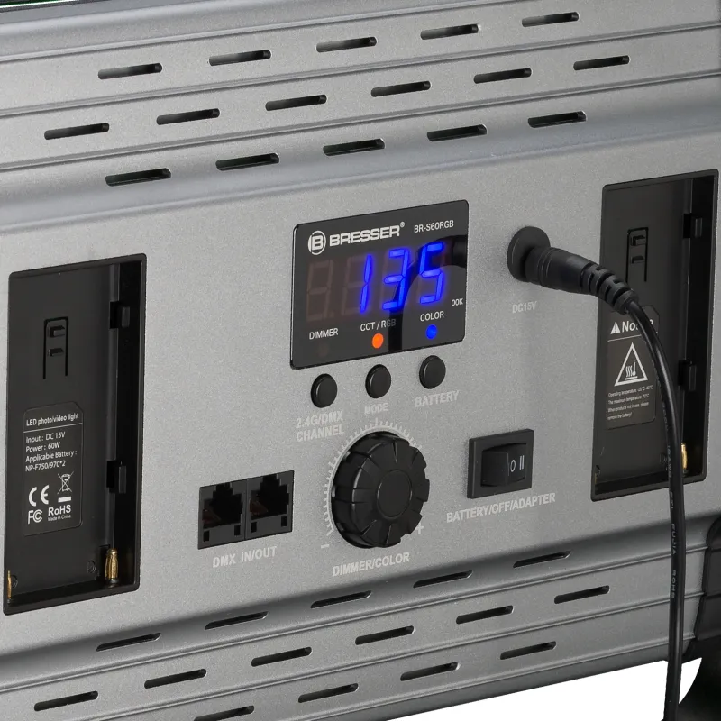 The all-rounder combines the entire spectrum of RGB colours and pure daylight with a total of 681 LEDs and opens up whole new perspectives in the photo or film studio with its slim yet robust design. The powerful 81 RGB LED s with 0 - 360 RGB full colours and 600 daylight LEDs can be conveniently adjusted in brightness and colour with the remote contro l. Great and individual coloured lightning effects in the field of photography and videography can be realised easily and in a user-friendly way. With a CRI value of 95 , the Daylight range from 3200K to 5600K . On top, the BRESSER BR-S60 RGB LED studio luminaire can be combined and controlled with other luminaires via the DMX connection . The practical flaps of the LED RGB panel luminaire create a successful spot effect.