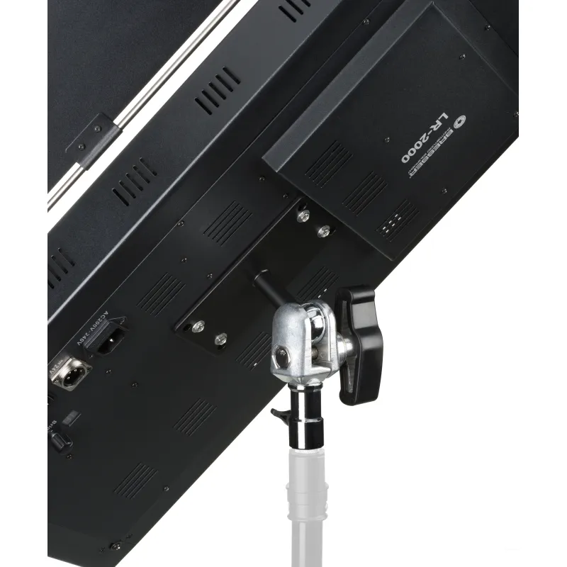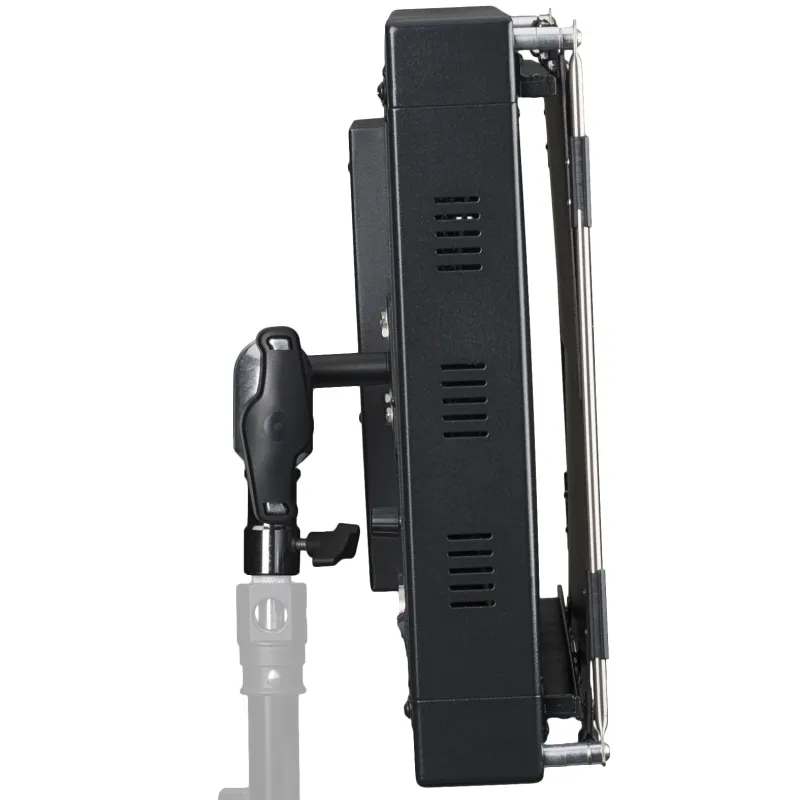 In addition, the BRESSER LR is distinguished by its powerful (200W) and uniform lighting over the entire range, which can be dimmed between 10% and 100% (digital display) via a handy dimmer on the back. A remote control is optionally available with up to nine lamps. On the back there is an AC socket for connection to the power supply as well as a three-pole 24V socket to connect the lamp to a battery. The solid aluminum bracket with "ball head" allows simple and precise positioning and alignment of the lamp.