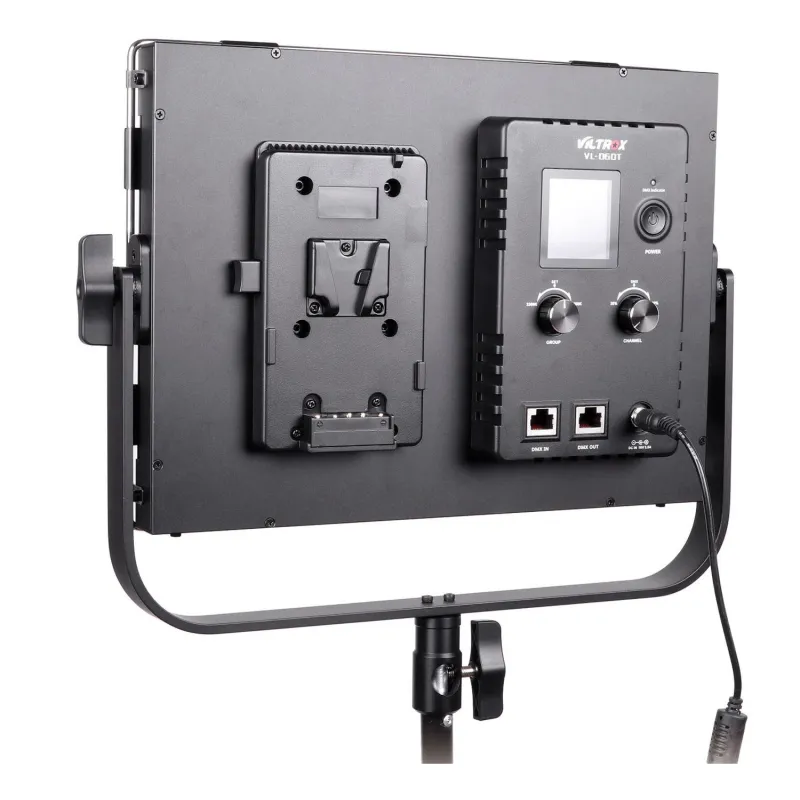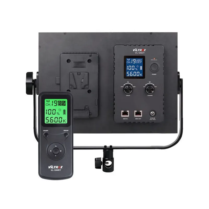 Color temperature and brightness may be controlled locally on the rear of the VL-D60T using the intuitive controls and LCD screen or by using the included 2.4 GHz wireless remote control. The wireless remote has a range of up to 65 feet and can control multiple lights in 19 groups and 6 channels. In addition, the RJ45 DMX in/out ports allow panels to be operated via DMX network connectivity.