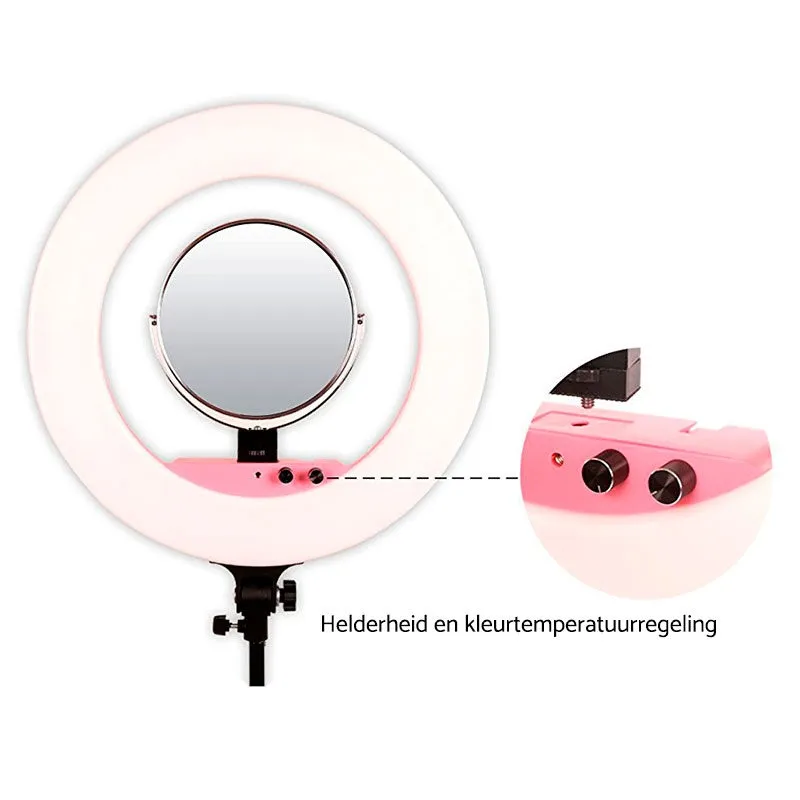 Caruba Round Vlogger 18 inch LED Set PRO with Bag - Pink The Caruba Round Vlogger LED set PRO has been developed for models, make-up artists and vloggers. Place the included make-up mirror and phone holder in the ring lamp and you can get started. This way you have the ideal set-up for making the perfect selfie or beauty vlog. The ring lamp provides a bright and natural lighting. To attach the accessories, the LF-R480 has two 1/4 "female threaded connections and a coldshoe. On top and on the sides additional coldshoe connections are available. This offers many possibilities for creative setups. With the spigot with tilting bracket, the LED lamp can be placed on almost any lamp stand.