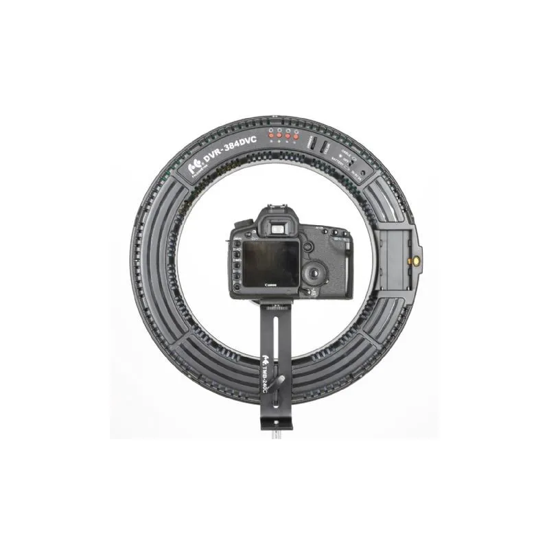 The DVR-384DVC from Falcon Eyes is a professional ring lamp, where you can set both color temperature and intensity steplessly. Thanks to the included mounting bracket, you can easily place the DVR-384DVC on a tripod. On the bottom of the DVR-512DVC you can find a 1/4 and 3/8 screw thread, which makes it compatible with almost any tripod. You can attach the camera easily on the mounting bracket, because of the screw thread connection. The 384 LED-lights of the DVR-384DVC spread the light on a small angle of 60 degrees. They have a CRI value of > 95 en last up to 50.000 hours.