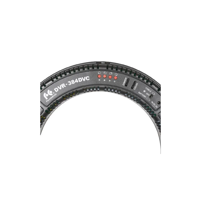 With the four red buttons on the backside of the DVR-384DVC you can switch the individual LED-sections on and off. This gives you even more control of the lightning of the subject. The DVR-384DVC comes with a power cable with EU-plug (230V). Do you want more freedom? Then there are optional batteries available. You can click two batteries ont the backside of the LED-ring and work without cables. You can find the compatible batteries at the 'optional accessories'.