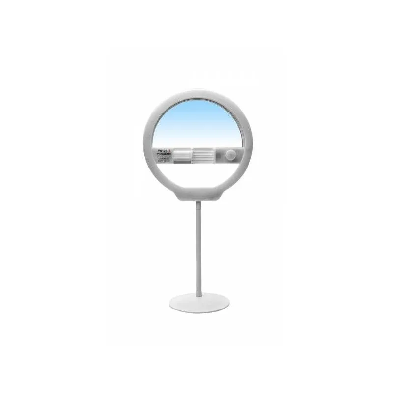 Yongnuo YN128 II is medium-sized, LED ring light with variable color temperature of light, built-in mirror and a phone holder.