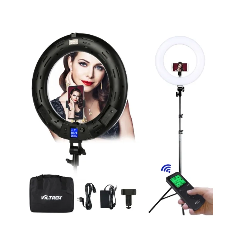 The Viltrox VL-600T LED Ring Light is a versatile ring lamp with various options. It is ideal for on the road, studio work or while vlogging. You operate the lamp remotely with the included remote control. The ring lamp has various positions such as cold, neutral and warm light.