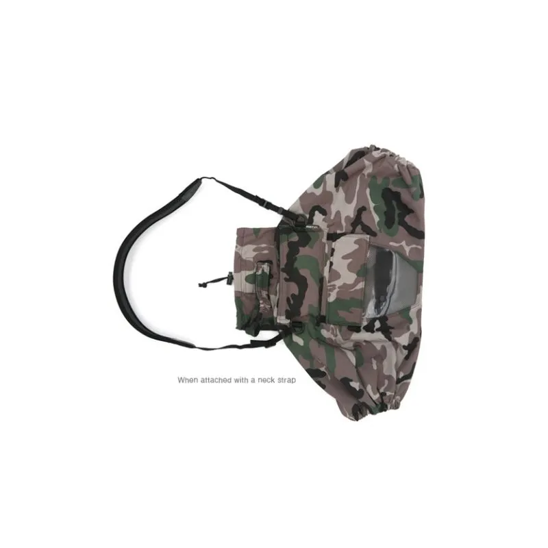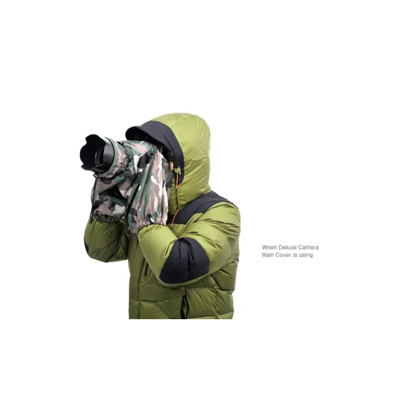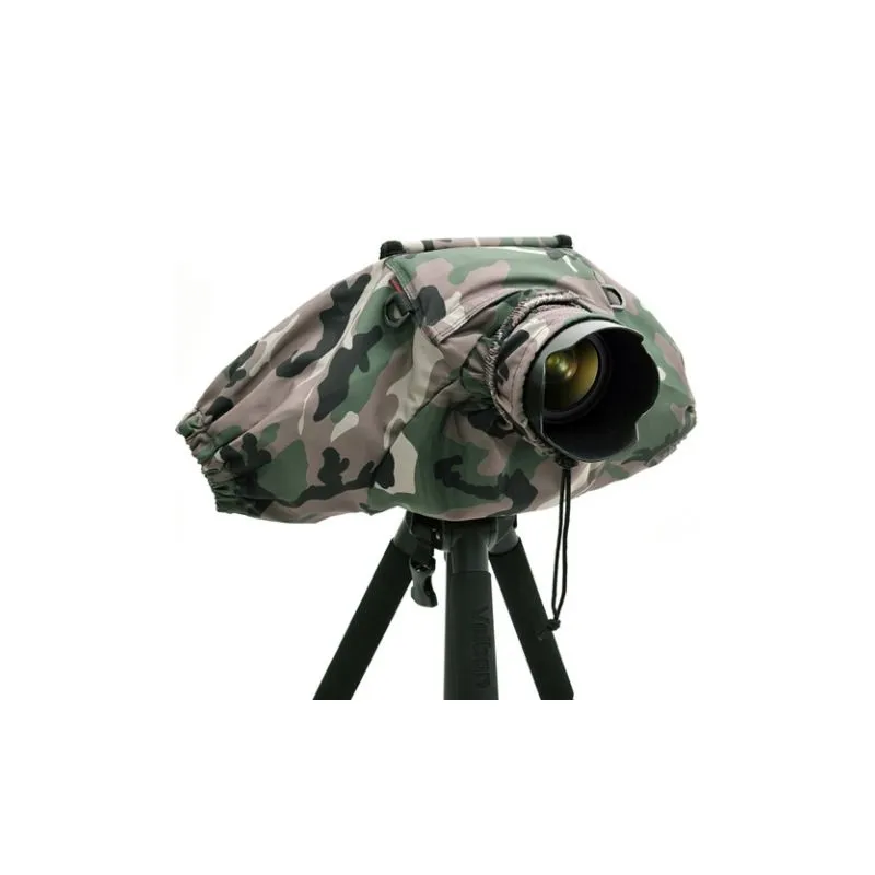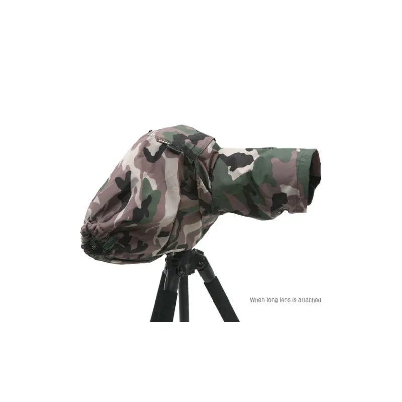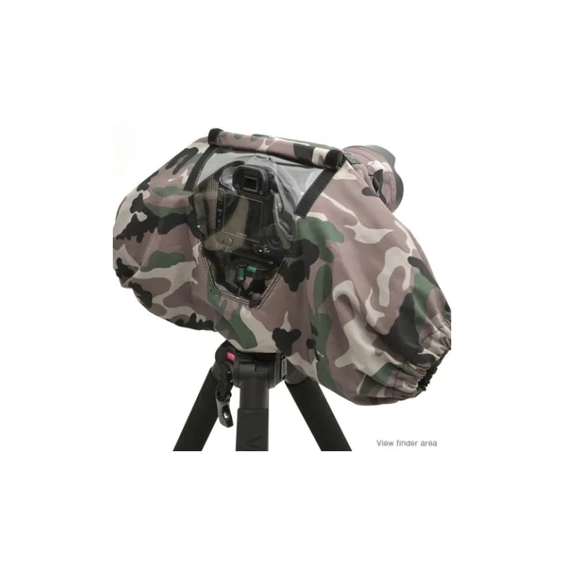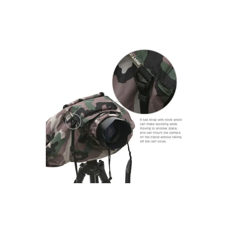 The Matin M-7101 Deluxe Camouflaged Camera Rain Cover is equipped with a transparent window allowing the viewfinder and LCD screen to be visible when the camera is fitted with the waterproof cover. On the left and right side of the cover are two holes, which act as sleeves for your arms. These sleeves are elasticized at the end to ensure a tight fit around your arms and thus prevent water and dust from reaching the camera.