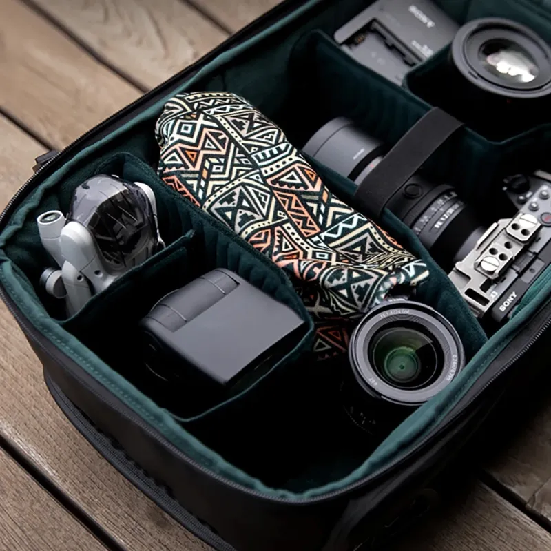It can be securely fitted around cameras, lenses, small tripods, filters, iPad or anything else.