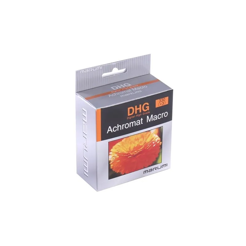 ;The Marumi DHG Achromatic Macro 330 +3 Filter is an achromatic conversion lens and is ideal for close up photography. The achromatic macro lens shortens the focal length, enabling you to capture an object/subject close up while maintaining a sharp focus on the object. By using a close up filter, you will be able to photograph an object from a shorter distance than your lens is normally able to.