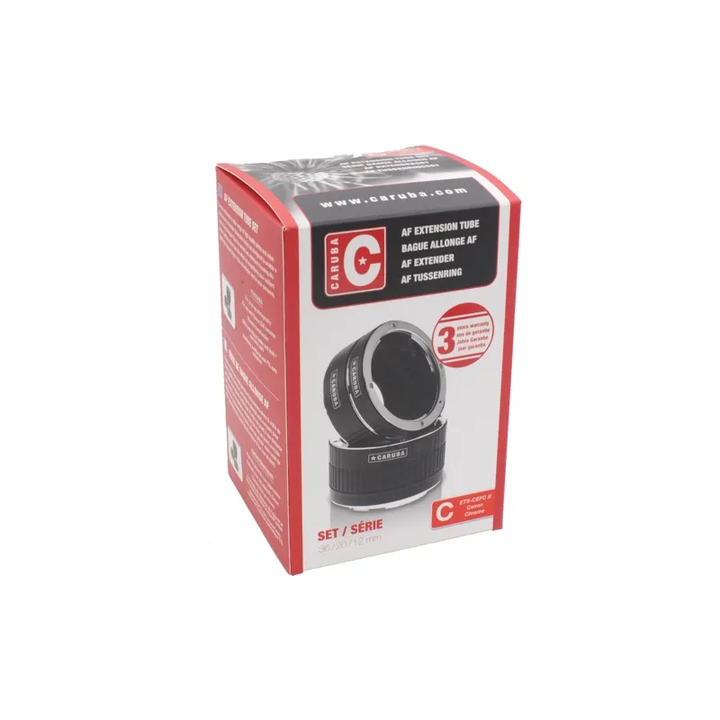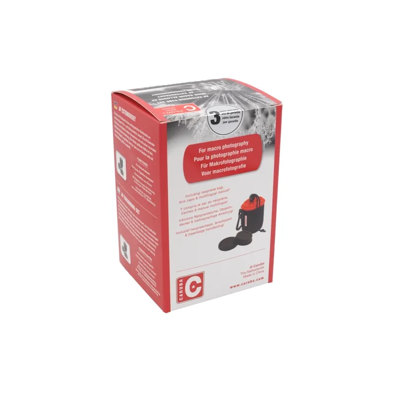 The Caruba Extension Tube Set for Canon consist of three extensions rings that can be used separately, or combined. The extensions tubes do not have any optical elements and therefore it is possible to photograph subjects larger and from a closer distance, without changing the quality of the image. The extensions tube have a chrome base and are compatible with Canon EF and EF-S lenses. Features such as auto focus and TTL light metering continue to work as usual. However, it is recommend to focus manually, as focus is very tight.
