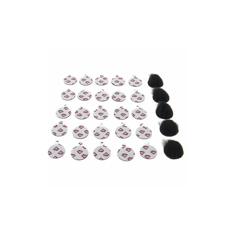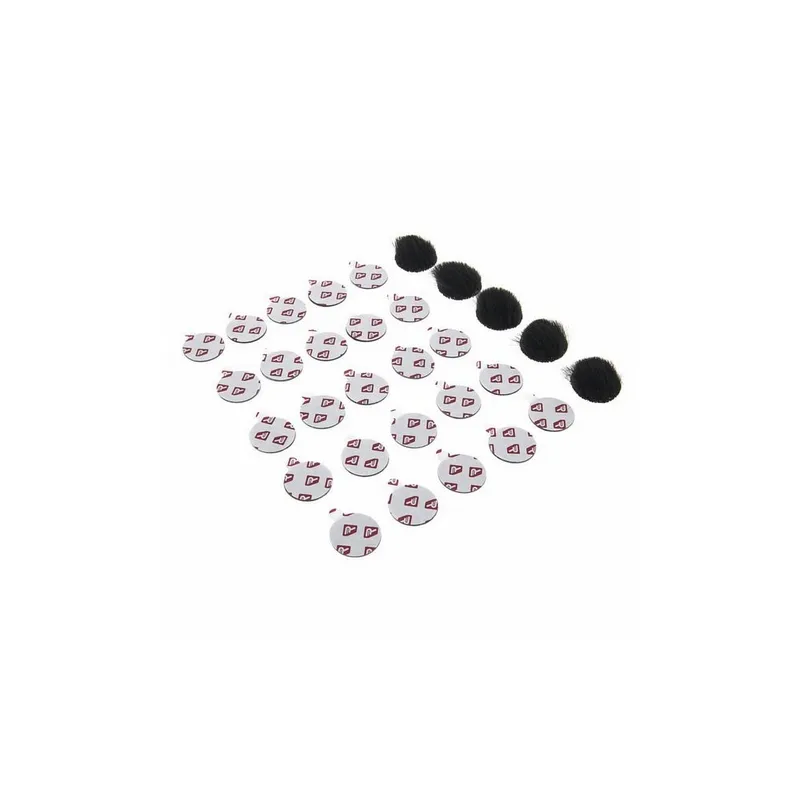 The black Overcovers Advanced, Wind Covers, and Adhesive Mounts for Lavalier Mics from Rycote include five 1" fur discs and twenty-five 0.9" round stickies. This kit is specifically designed for use with small personal microphones in windy outdoor conditions. Use the stickies to affix a lavalier mic onto the skin or on top of clothing. Overcovers are made of a fur windjammer that can be affixed on top of the lav microphone, delivering excellent wind noise protection. The larger size (1") fur overcover is designed to match the DPA concealers.
