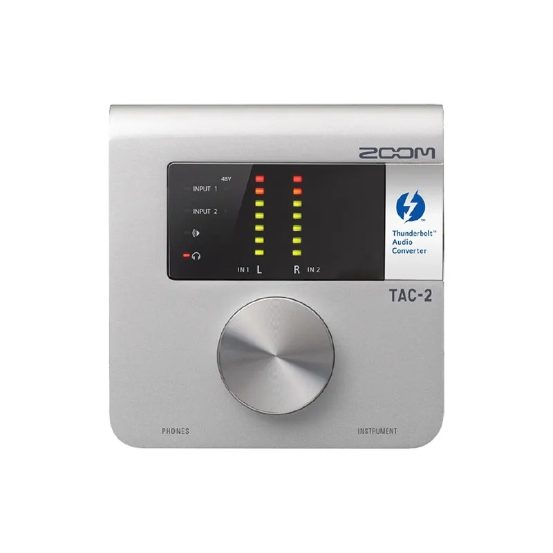 The Zoom TAC-2 is a compact 2-in, 2-out bus-powered Thunderbolt audio interface that allows for ultra-low latency and supports audio up to 24-bit/192kHz. It features two balanced XLR/TRS inputs with 48V phantom power, a Hi-Z input jack for electric guitars and basses and two balanced TRS outputs for connecting an amplifier or powered speakers.