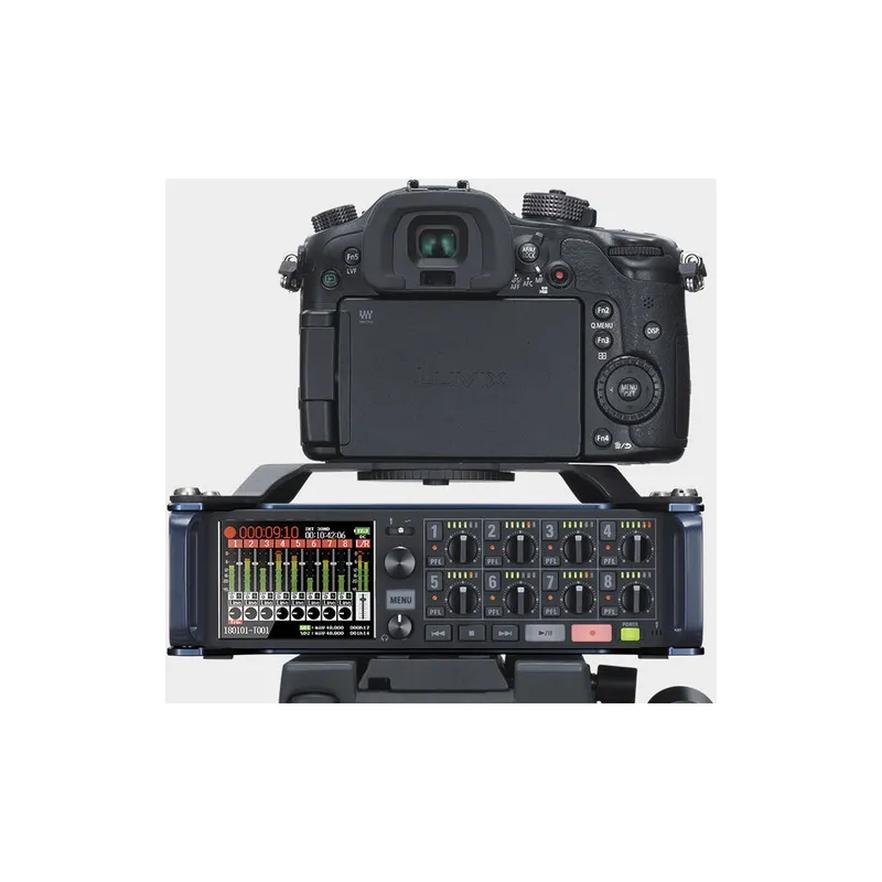 The CMF-8 Camera Mount Adapter from Zoom is an accessory attachment for the Zoom F8 and F8n Multitrack Field Recorders (sold separately). The CMF-8 can be used to securely mount your DSLR camera onto the F8 or F8n recorder via an integrated 1/4"-20 screw. It allows for full recorder access.