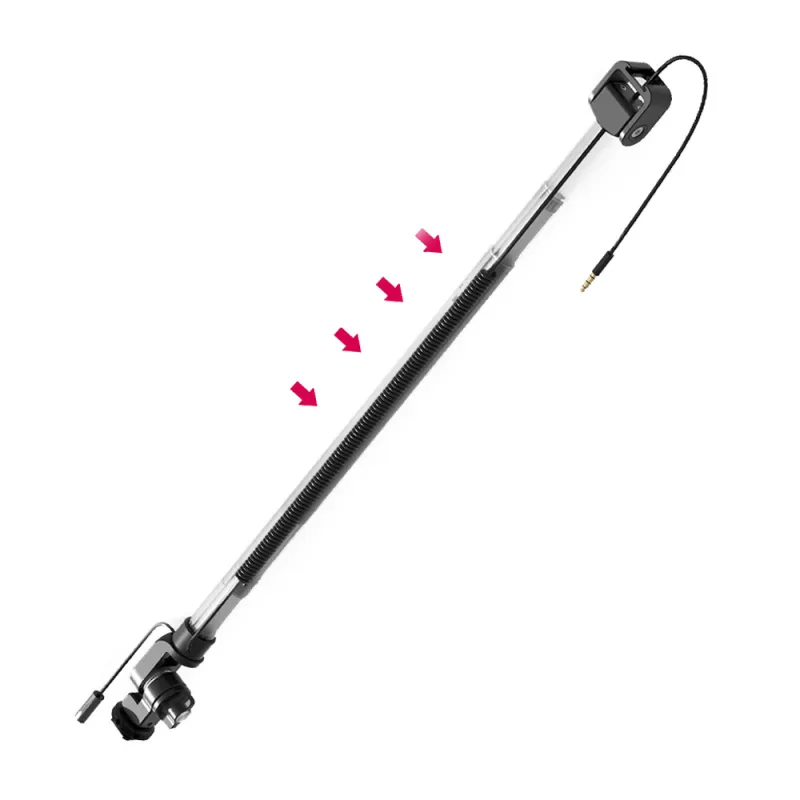 Be daugiau laisvų laidų; integruotas 3.5 mm spyruoklinis laidas yra tiesiogiai integruotas į laikiklį ir baigiasi fiksuota 3.5 mm jungtimi. Tai užtikrina elegantišką, organizuotą išvaizdą ir užkerta kelią netvarkingiems laidams įrašymo metu. Būkite atsargūs, kad nepertemptumėte ar nesukeltumėte laikiklio per greitai, kad išvengtumėte vidinio laido pažeidimo.