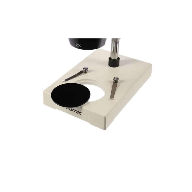 The BYO-ST3 has a solid metal body with an integrated table of 110 by 75 mm. It is equipped with two solid clamps to hold the specimen in position, so it does not shift during observation. In the table there is a contrast plate of Ø60mm. This contrast plate is white on one side and black on the other side.