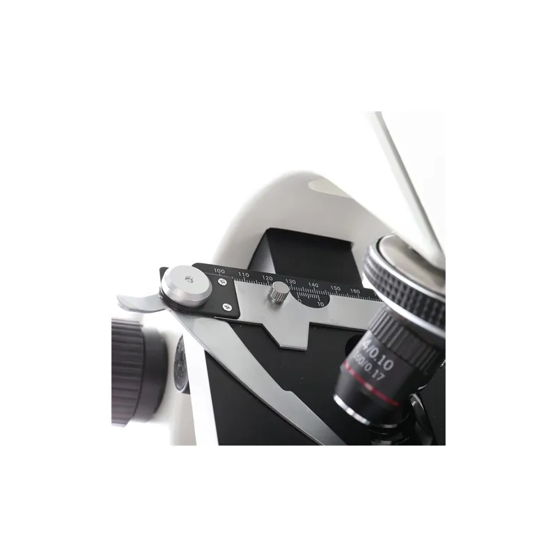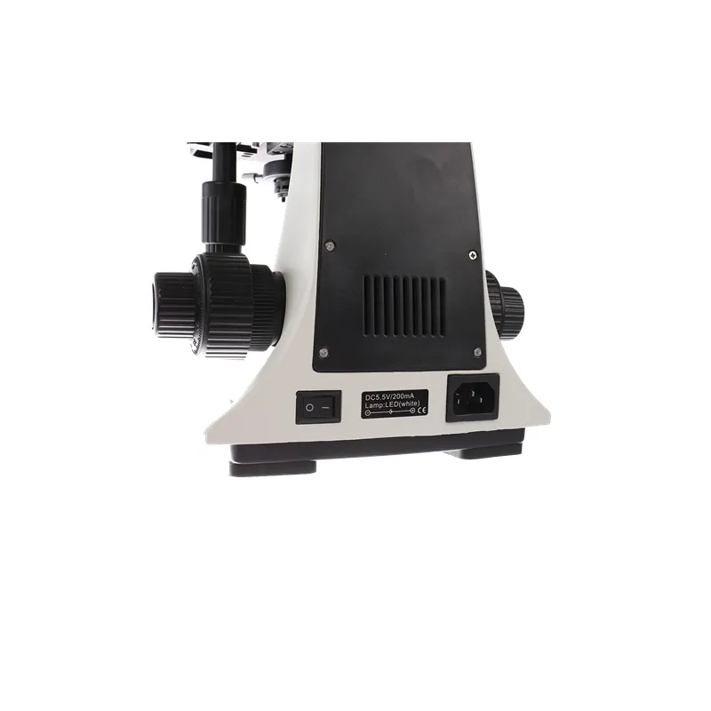 The backlight of the Byomic BYO-500T comes from a LED in the base of the microscope. This LED is adjustable with the turning wheel on the left side of the microscope. Under the table is the Abbe Condenser, which ensures that the light is distributed as efficiently and evenly as possible over the object in order to obtain the best results.