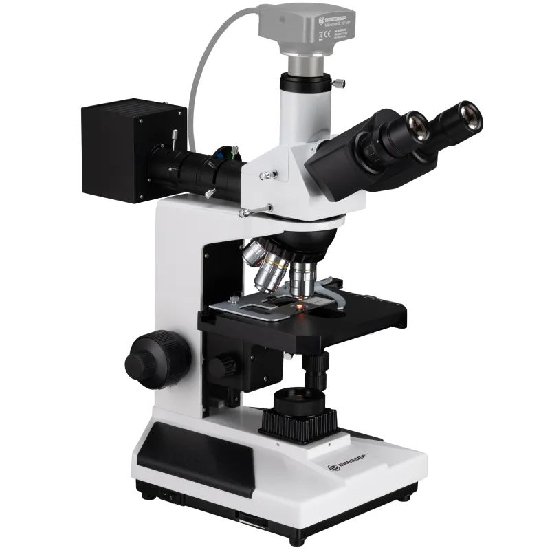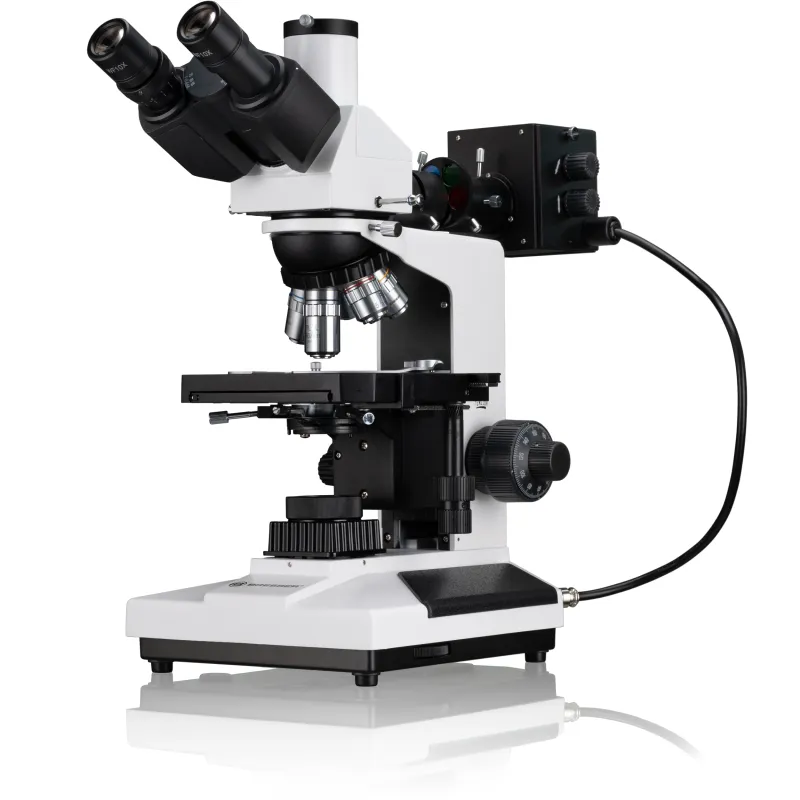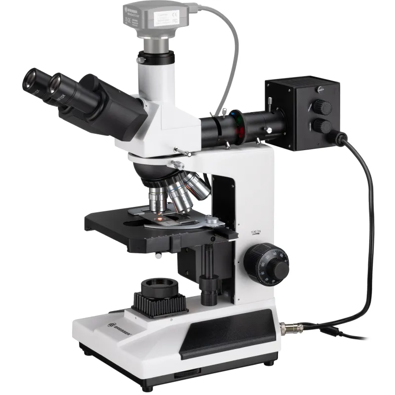 In the microscope's basis, there are a transmitted light halogen illuminator (20 W) as well as the power supply and the continuous adjustable dimmers for reflected light and transmitted light . The trinocular head attachment works with both illumination modes. It also allows photography and binocular visual observation. The inclination of the eyepiece tubes is 30°. With the polarization head attachment, the instrument is suitable for the internal structure of materials and for condition monitoring of different mechanical apparatus in college and factory. The reflected light halogen illumination (20W), which goes through the objective onto the object, can be modified for special purposes with a colour filter wheel and the polarizer/analyzer combination. The Science ADL 601P is an instrument with an excellent value for money. It has also the other features, which are typical for high-quality microscopes: fourfold objective nosepiece, lengthwise and cross moveable stage, coaxial focusing knobs (concerning fine drive: 200 µm / full turn), adjustment of eye relief, diopter adjustment and the phototube. Optional available, general accessories are the wide field eyepieces (WF10x, WF16x), the dividing eyepiece (WF10x), different planachromatic DIN objectives (e.g. 4x, 5x, 10x, 20x, 40x retractable, 60x retractable, 100x-oil retractable), the Abbe condenser (numerical aperture 1,25; with iris diaphragm and auxiliary lens), dark field condensers (dry and oil), immersion oil, the phase contrast set, a field diaphragm (in order to obtain Köhler illumination) and filters (blue, green, yellow, ground glass, polarization).