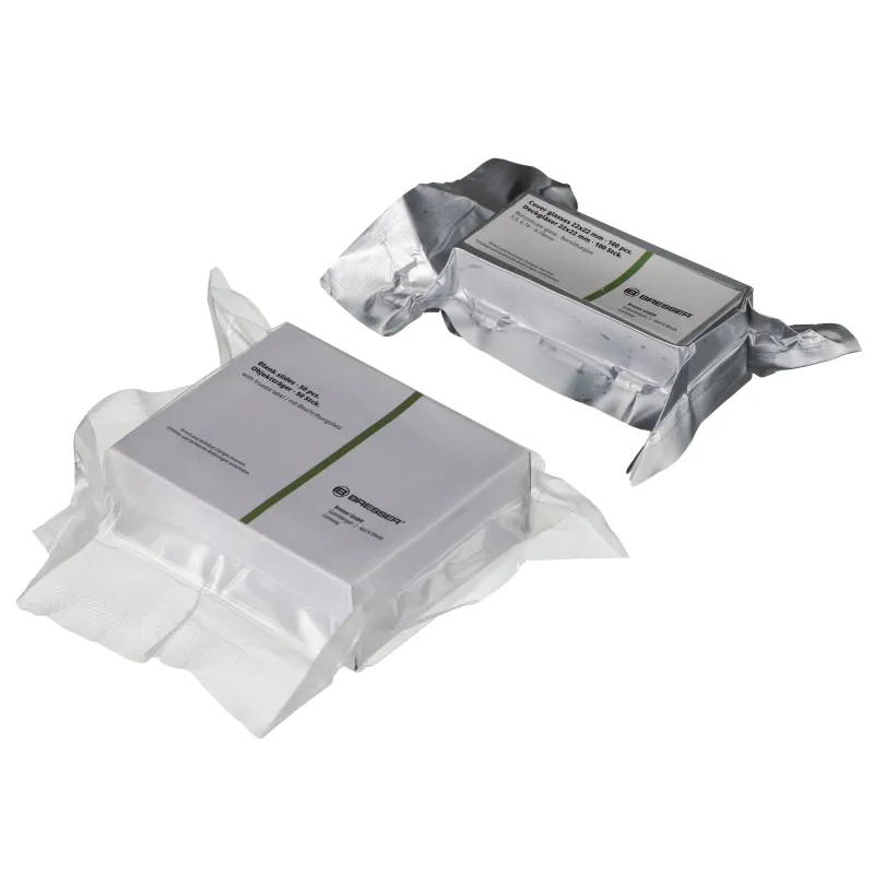 The slides are made of soda lime glass, and have ground edges for safe handling. They have a matte field for writing on both sides (top and bottom). Slides and cover glasses are packed separately and in a vacuum sealed bag , containing moisture absorbent. They can be stored for a long time without loss of quality from hydrolysis and are easy to take out.