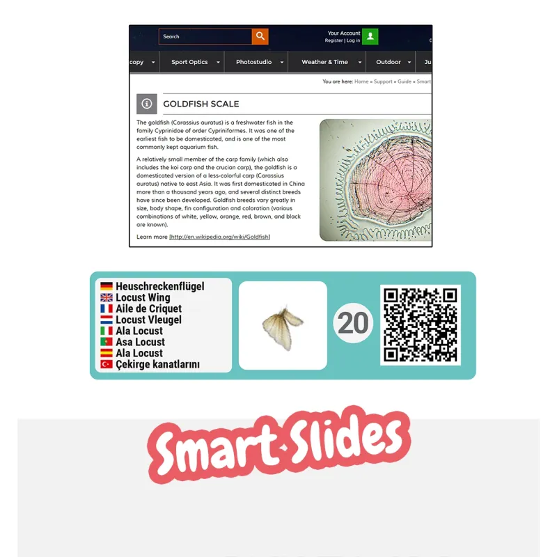 You can also scan the specimen QR codes to find out more about the specimen. In addition, you can secure your smartphone to the microscope via the adapter in order to save and share images of your specimens.