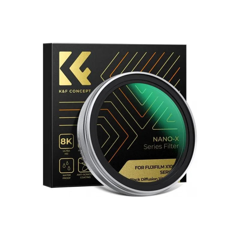 This black pro mist 1/4 filter is designed for Fujifilm Cameras X100, X100F, X100S, X100T, X100V, and X100VI. It creates a soft, dreamy halo effect, reducing contrast and sharpness, while enhancing skin tones for a more natural appearance.
