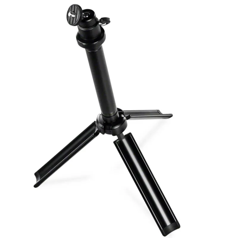 The tripod with a minimum height of approx. 35.5cm and a maximum extension height of approx. 38cm is an ideal table tripod. As the legs of the tripod can be folded up, it can be collapsed into a very compact size. Due to its small size it also fits into small bags and backpacks. With a simple rotatory motion, you lock the legs into position. The height of the tripod can be adjusted steplessly and is locked in place quickly and easily with a rotatory motion as well. The tripod is set up and disassembled within seconds.