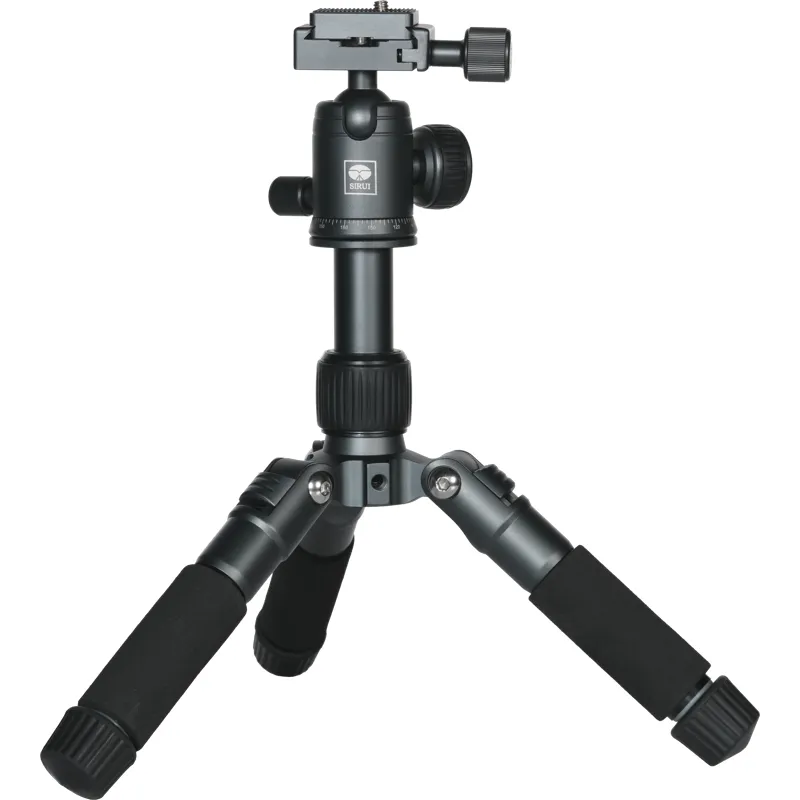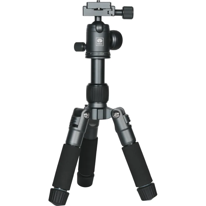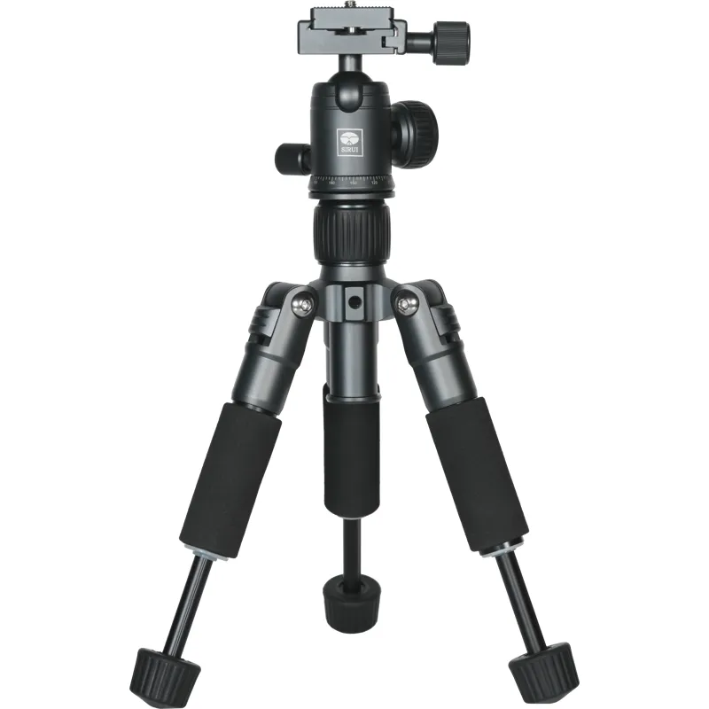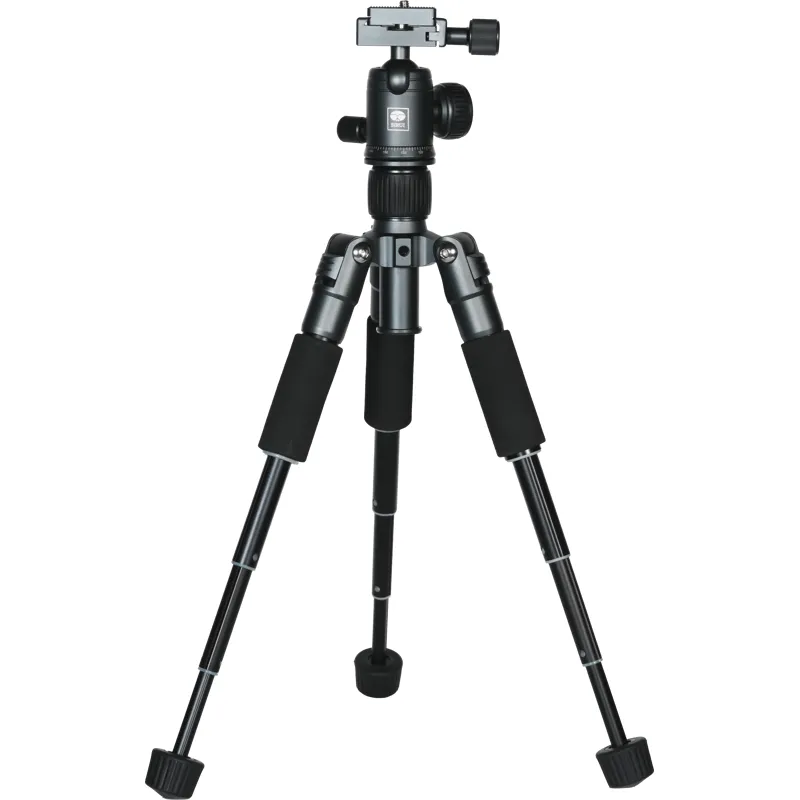 The tripod comes with a ball head featuring a quick-release plate and panning function.