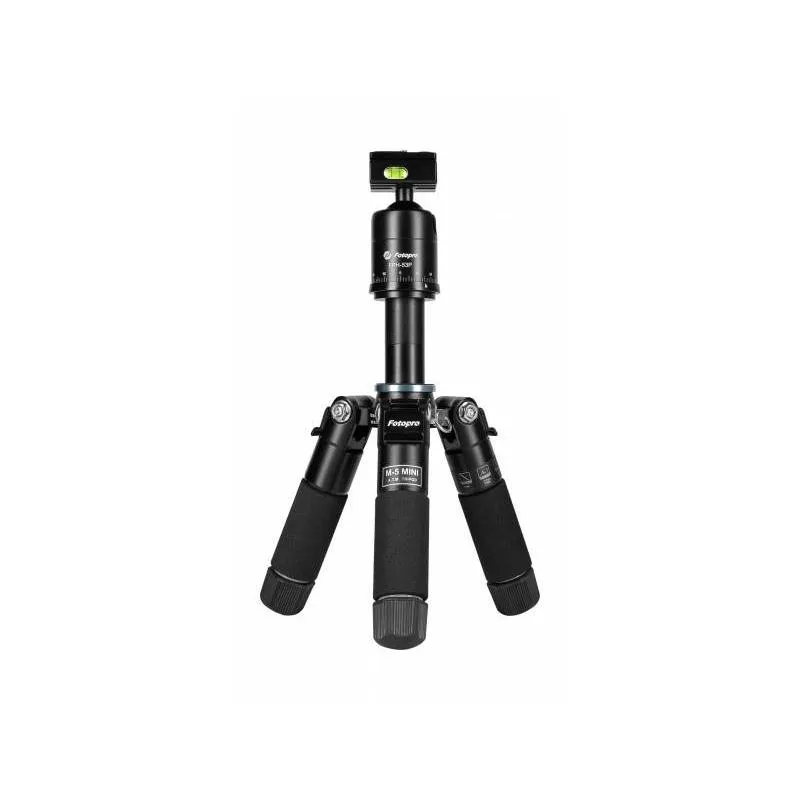 The M-5 Mini tripod is equipped with the FPH-53P ball head with Arca Swiss standard quick-mount plate. The head has a set of three spirit levels and a quick release lock to prevent accidental unplugging of mounted equipment.
