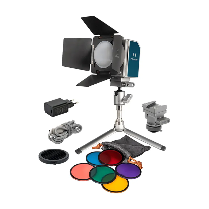 The LED can be controlled via Bluetooth or through intuitive control devices on the lamp head, and the handle-type control buttons are designed for easy adjustment of the light, even when wearing gloves. The lamp features a magnetic mounting system that allows for quick and easy attachment and detachment of accessories such as a diffuser dome, barn doors, or color filter gels. The light is powered by a built-in rechargeable 3000 mAh battery, but it can also be operated with an additional V-mount battery.