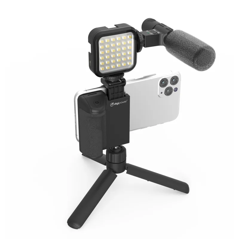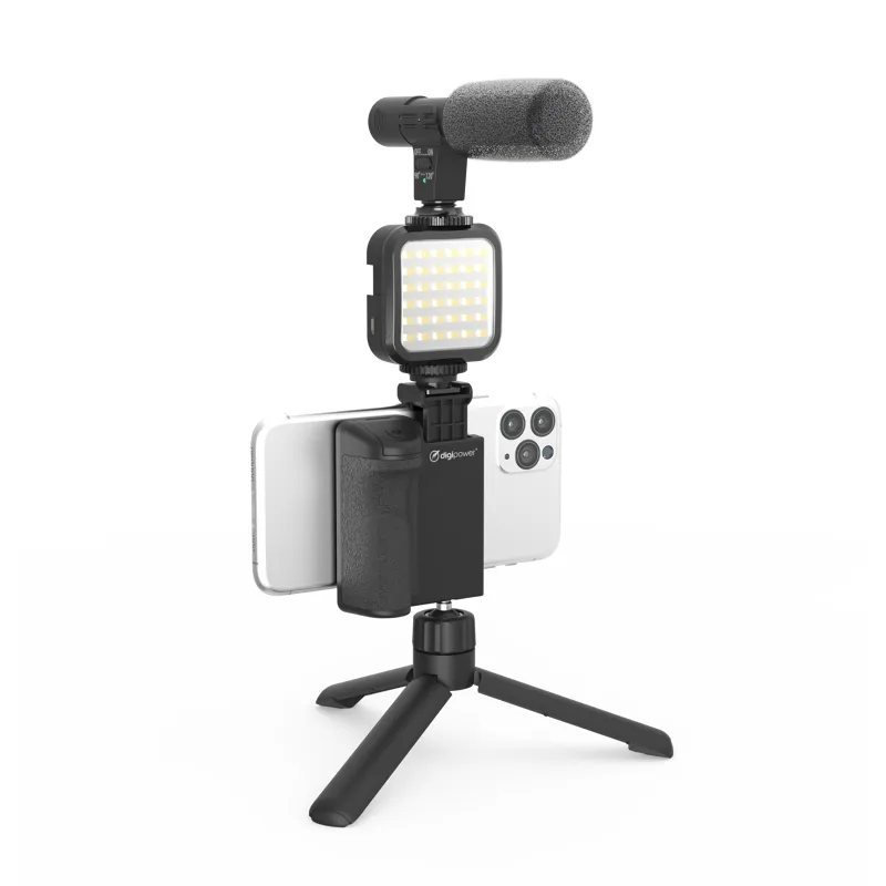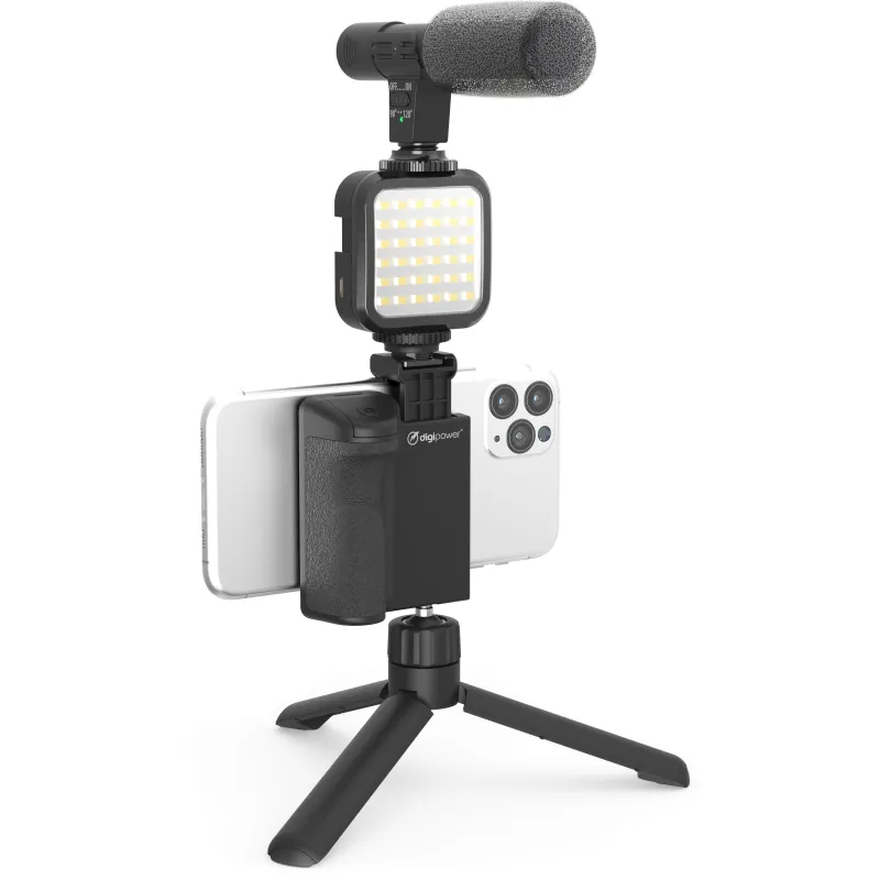 Komplektā ietilpst universāls mikrofons, kas darbojas ar jebkuru viedtālruni vai kameru, gaisma ar 36 īpaši spilgtām LED un galda statīvs ar universālu stiprinājumu, kas lieliski darbojas ar jebkuru kameru (vienas lēcas digitālajām spoguļkamerām (DSLR), bezspoguļkamerām, sporta kamerām).
