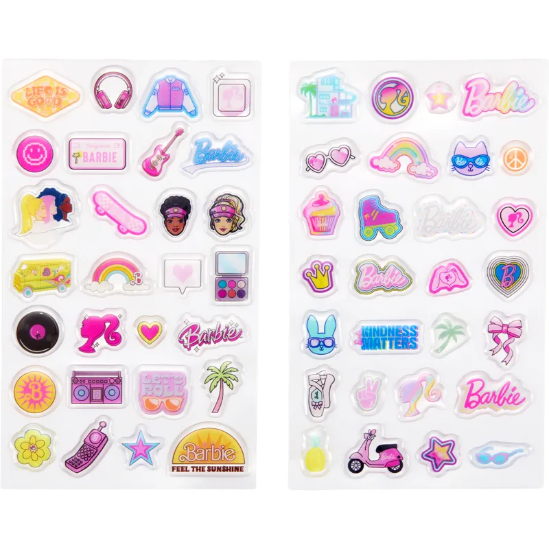 Pridėkite Barbie blizgesio prie savo kameros, albumų, nuotraukų, atvirukų, žurnalų, plakatų, spintelių ir dar daugiau! Šie ikoniški lipdukai apšviečia bet kurią paviršių su momentiniais Cali vibracijomis.