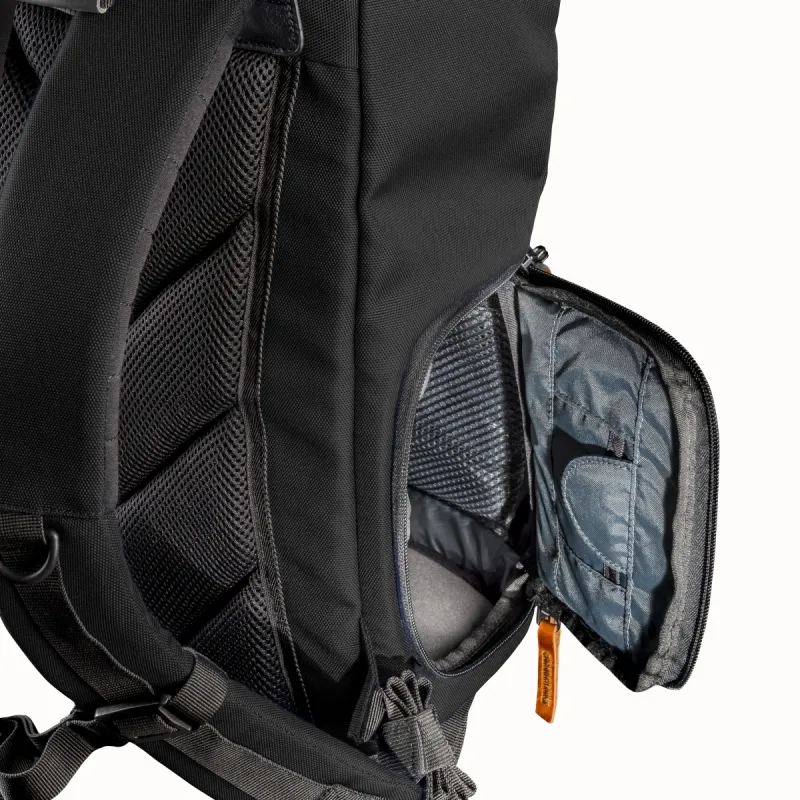 Plačios, paminkštintos petnešos užtikrina patogumą nešiojant. Jos gali būti reguliuojamos ir turi anatominę formą. Viršuje taip pat yra patogus nešimo rankena su sustiprintomis siūlėmis. Įmontuoti putų pagalvėlės sugeria smūgius ir užtikrina puikią jūsų įrangos apsaugą. Kuprinė pagaminta iš atsparaus ir plyšimams atsparaus nailono ir įeina lietaus danga.
