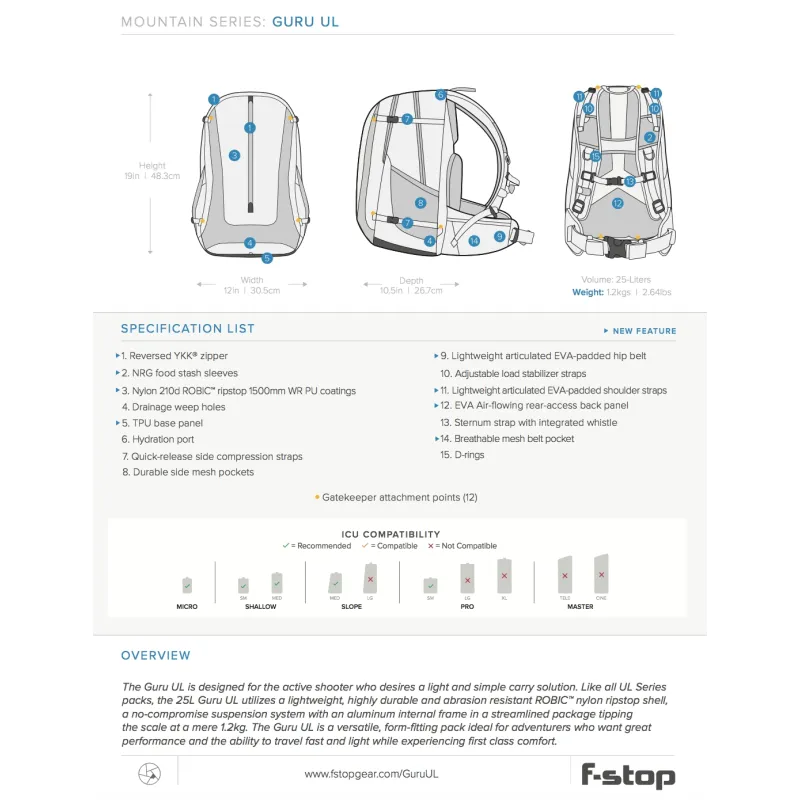 You need an F-Stop Pro ICU to organize the bag! The F-Stop ICUs are available in different sizes. For the Guru UL, you can choose from the Small Pro ICU, the Small or Medium Size Shallow ICU or the Medium Size Slope ICU