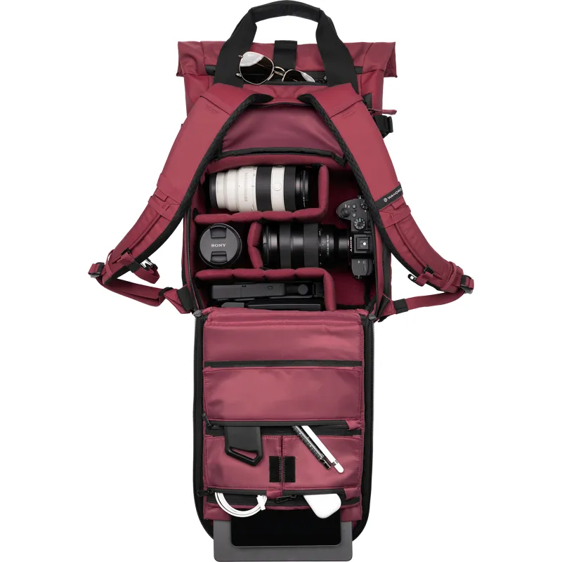 WANDRD PRVKE FOTO PAKETAS 15L Rhone Burgundy sukurtas fotografams, ieškantiems universalaus ir stilingo sprendimo savo įrangai nešti. Šis paketas apima erdvų 15L kuprinę, kuri gali talpinti įvairią foto įrangą, įskaitant kamerą, objektyvus ir priedus.
