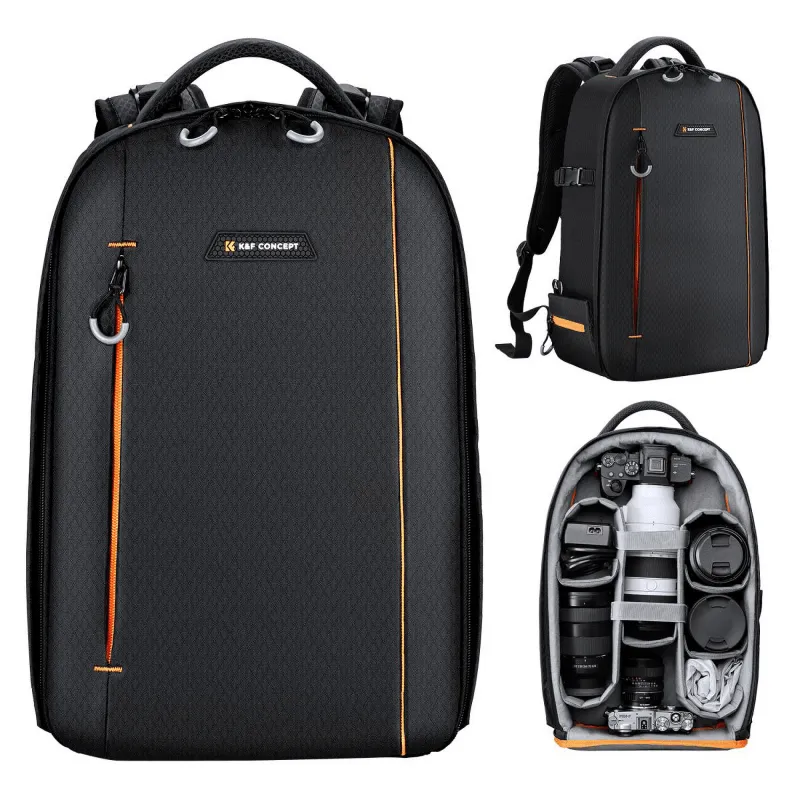The K&F Concept Beta Backpack is an ideal choice for photographers and filmmakers seeking a lightweight, functional solution for transporting their gear. With a capacity of 18 liters and weighing just 950 grams, it accommodates a 14-inch laptop, drone, camera, flash, three lenses, notebook, tripod, and cables.