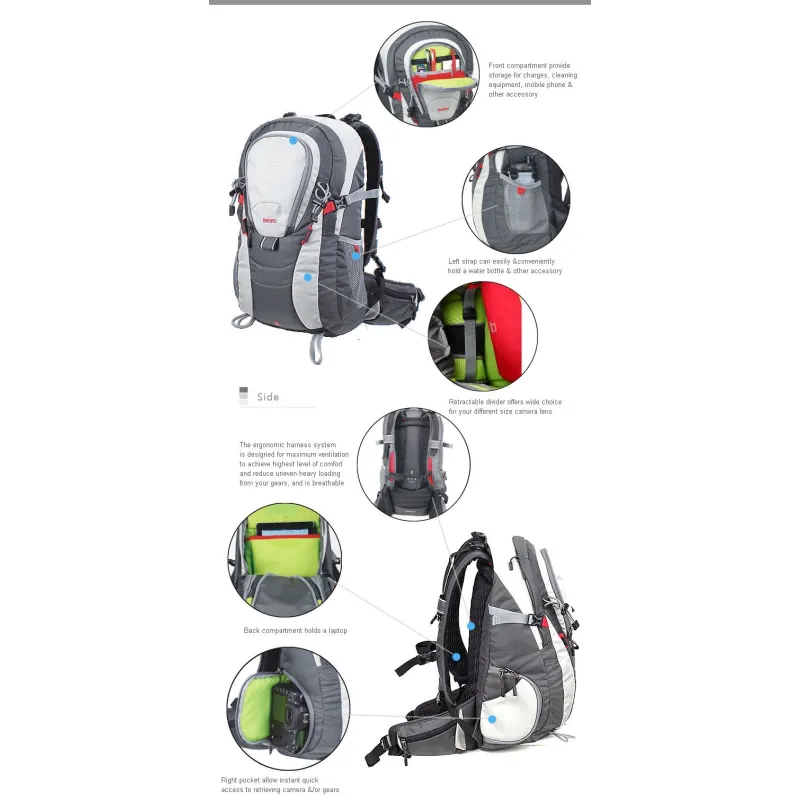 BENRO Study and light weight Hummer series backpack is specially designed for outdoor photographers; it is a perfect choice for photographers who profer to 1-2 days short trip. There is specific holder design for hiking stick and ice tool, the ergonomic harness system is design for maximum ventilation to achieve highest level of comfort. Retractable divider offers wide choice for your different size camera lens, it adopts Retro-reflecting matericals on the former and shoulder strap offering great safety during night. The lockable YKK zippers designing on left fast opening has anti-theft function.