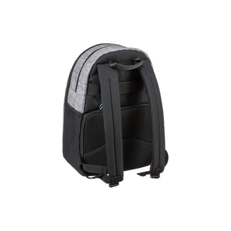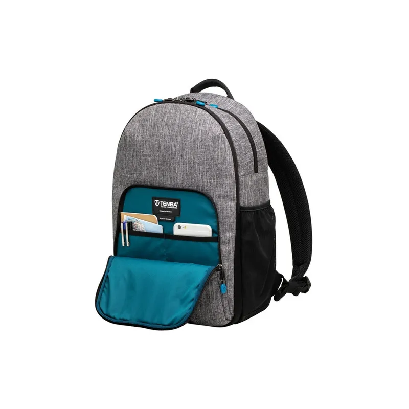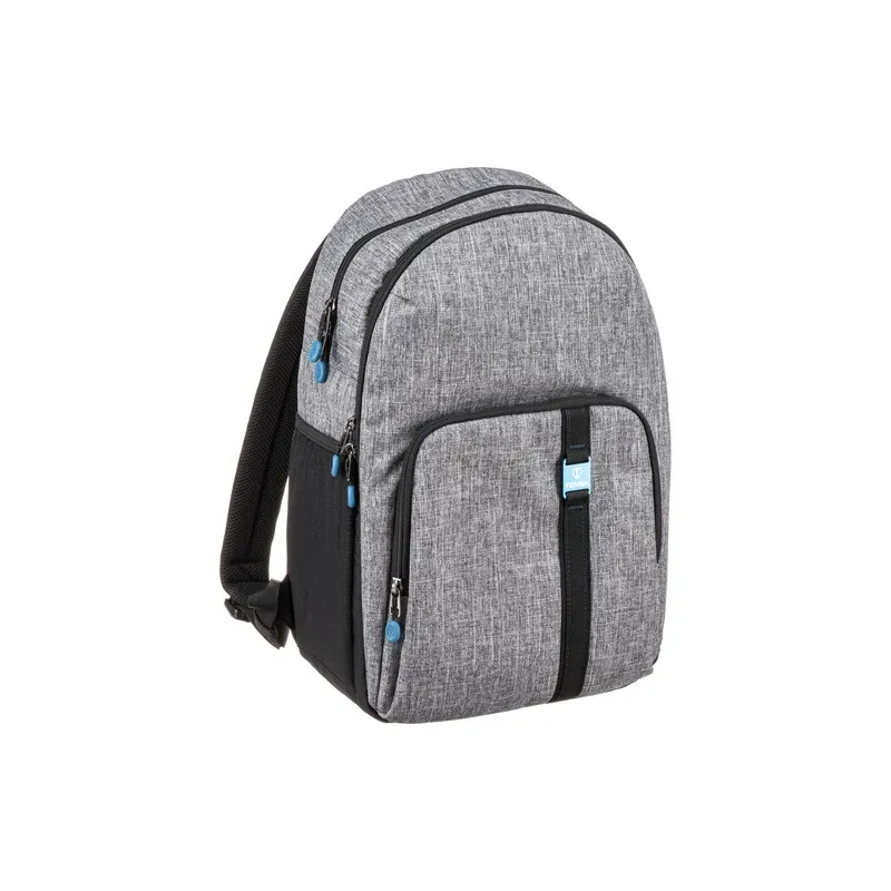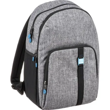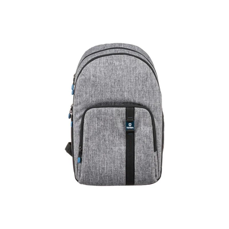 The Tenba Skyline 13 Backpack in gray is made from water-repellent polyester and has durable reinforced stitching for long-term use. It holds a mirrorless or pro DSLR camera with an attached 70-200mm lens, two additional lenses, and a flash.