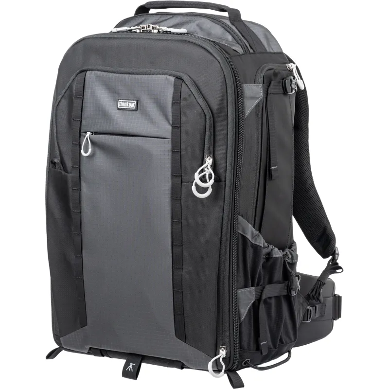 - Ietver statīva/monopoda stiprinājuma sistēmu priekšpusē vai sānos