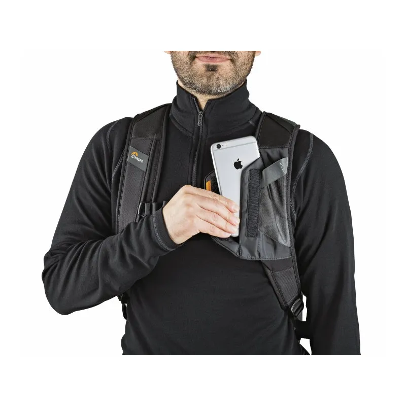 PhoneZone shoulder strap pocket holds up to plus size smartphones and allows fast access while wearing the pack.