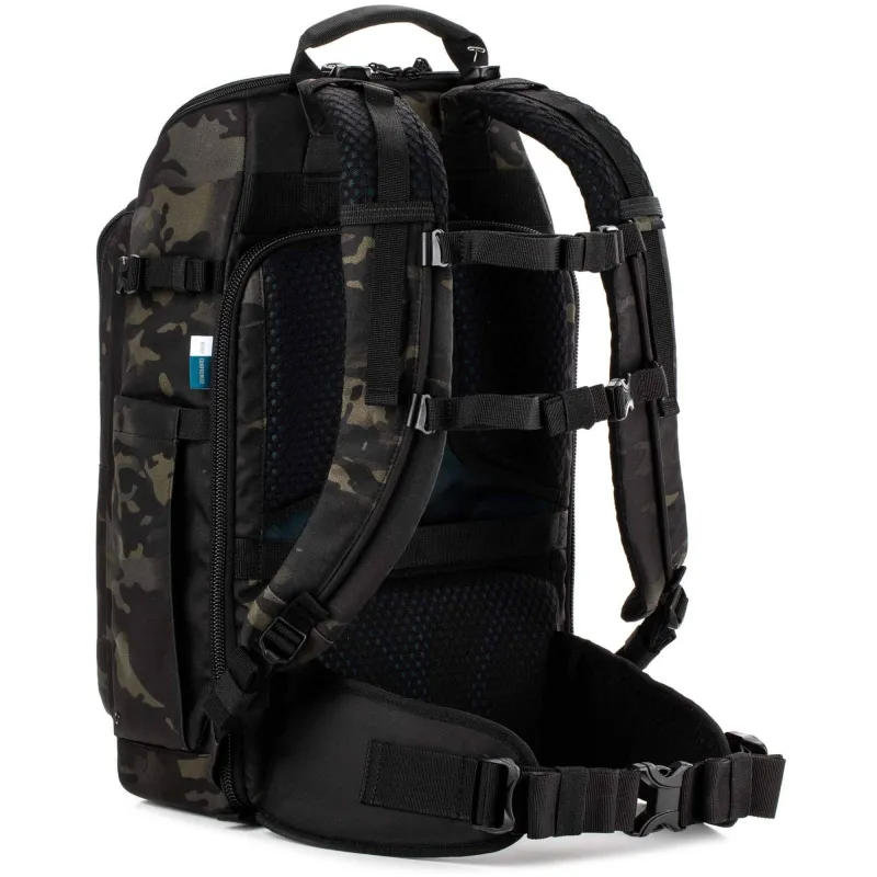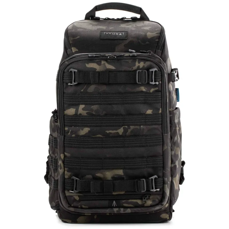 The updated multicam black, 32L Axis V2 Backpack from Tenba is built for the working professional, content creator, photographer, or filmmaker. The pack holds two mirrorless, DSLR, or Cine cameras, nine 2.8mm lenses, a 17" laptop, and a compact drone. This backpack is the first to include a hidden neoprene pocket that holds an Apple AirTag or Tile Bluetooth Tracker. The MOLLE webbing all around the exterior of the pack allows you to add additional Tenba accessories, including lens capsules, battery pouches, and card wallets.